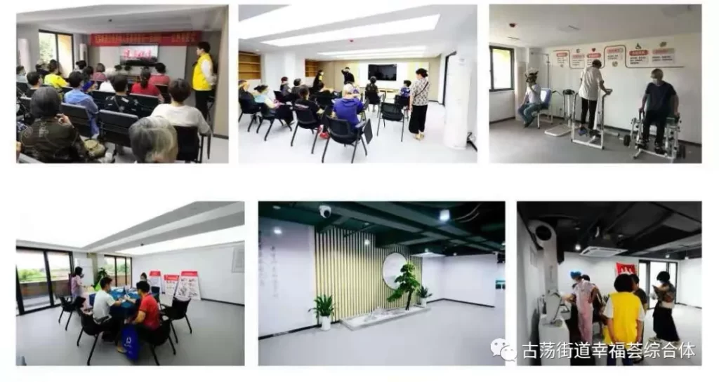 日间照料中心位于综合体三楼,为辖区内老年人提供日间托管和短期托管服务。内设健康小屋、乒乓球室、棋牌室、洗衣房、 助浴室、老年人影视厅、老年大学、康复器材区等。为老年人提供自助健康检测、健康自我评估与健康指导干预服务。同时,提供 应急救护等知识培训与实操训练,组织居民家庭照护服务技能培训,定期推出主题课程,邀请老师进行讲座授课丰富老年人生活。
